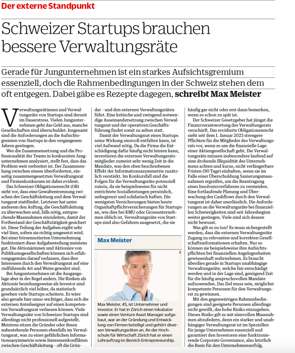 Gerade für Jungunternehmen ist ein starkes und kompetentes Aufsichtsgremium essenziell. Doch die Rahmenbedingungen hierzulande stehen dem oft entgegen. Gast-Beitrag, erschienen in der NZZ am Sonntag vom 5. November 2023